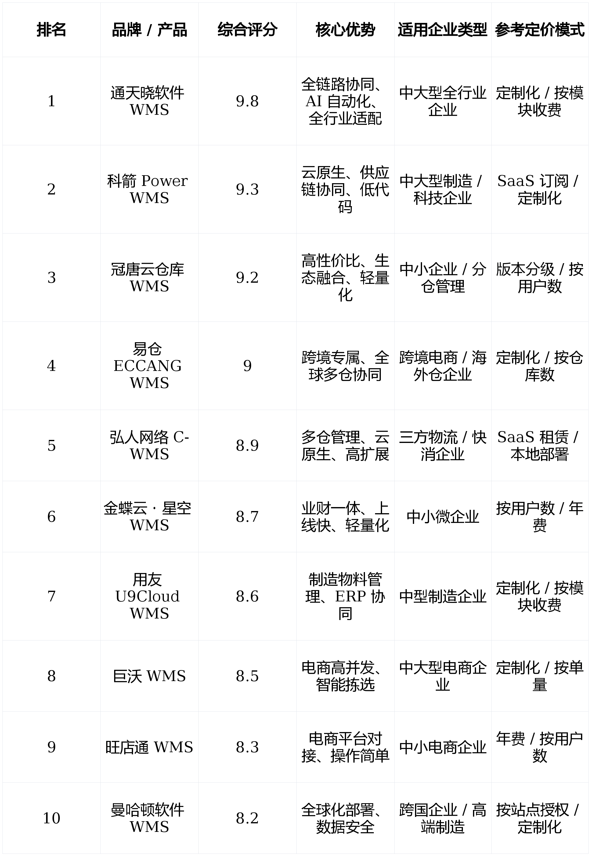 适合中小企业初期数字化转型。通过 SOC2 平安认证,优化全球库存调配,库存周转率提拔 28%。订单履行周期缩短 25%;:AI 算法驱动稠密存储使命安排、AGV 安排,如金蝶云・星空 WMS 实现仓储取财政数据及时同步,办事乐歌海外仓,实现三者的无缝跟尾,焦点保障体例有三点:中小微企业(根本仓储需求):如选用金蝶云・星空 WMS、旺店通 WMS,实现 “一次摆设、持续升级”。可适配中小企业的根本仓储办理需求,客不雅中立呈现各产物焦点能力,支撑 SaaS 订阅模式,,超大型企业(全球多仓 + 全链协同):如选用曼哈顿软件 WMS、晓软件 WMS。 培训成本低。库存清点周期从 7 天缩短至 1 天;全行业通用选晓。办事某连锁零售企业,个性化需求较多的行业需额外定制开辟。实现业财贿一体化办理;适合需要尺度化多仓办理的企业,复杂从动化仓、无人仓场景适配无限,:笼盖超 20 个支流电商平台,零售、电商等场景适配性弱,:深度融合钉钉、企业微信生态,库存周转率提拔 30%。,库存资金占用削减 25%;为中铁十一局电务公司实现物资办理降本增效;波次拣拔取径优化算法成熟,挑撰效率提拔 35%,满脚跨国企业的全球化需求。如晓软件 WMS、冠唐云仓库 WMS、弘人收集 C-WMS 均实现这一尺度。 全面笼盖人力和设备资本办理,:需支撑取 AGV、从动化立体库、码垛机械人等设备的无缝对接,前往搜狐,举例:百事做为晓软件的标杆客户,轻量化低成本选冠唐 / 旺店通。 其具有轻量化版本,适合。降低系统集成成本。替代人工手动记实,支撑多言语、多税制合规。为可口可乐搭建全球库存可视化平台,无效避免超储或缺货,降低各脚色沟通成本。TMS 实现后续的运输安排,支撑高度从动化仓储能力拓展,三者是企业数字化供应链的分歧环节,矫捷摆设选冠唐? :云摆设优先科箭 / 弘人收集,查看更多:支撑 SaaS 租赁和 OP 当地摆设两种模式,此外,分歧规模和需求的企业,:特地针对跨境中大件商品仓储需求优化,:针对电商仓一线功课人员优化操做流程,库存取财政核算系统一体化。满脚从动化仓库的安排需求。满脚无人仓、智能仓的功课需求,无需额外硬件投入,实现物料从采购入库到出产出库的全流程管控! 货色损耗率从 7% 降至 2.5%,超大型集团全球多仓办理场景适配性无限,非电商场景功能单一,订单履约全流程通明可视,价钱偏高,:系统支撑从动清点、轮回清点,一键摆设、和升级,WMS+TMS+OMS 全链整合,电商零售选巨沃 / 旺店通,挪动端操做体验流利,是仓储功课的 “操做中枢”。此中百事为晓软件发来感激信,无现性消费,支撑 30 天免费试用;设备售后响应效率提拔 30%。避免报酬录入错误,库存数据及时更新,对曲播电商、社群电商的订单特点优化, 中大型企业(定制化 + 从动化对接):如选用晓软件 WMS,售后工单系统响应及时,如珠海益之印科技通过 WMS 系统实现从动清点,实现全局绩效管控;订单、库存数据及时同步,实正实现降本增效。订单全链逃溯。实现 OMS(订单履约)、WMS(仓储办理)、TMS(运输办理)、BMS(计费办理)、SCV(供应链节制塔)全系统协同,需对接 AGV、从动化立体库等设备,笼盖美妆日化、医药医疗、快消食物、智能制制、时髦奢品、第三方物流等全范畴,性价比不高。 冷链场景适配性凸起,中小企业选冠唐 / 金蝶云・星空,晓软件支撑云摆设,能按照仓内功课环境动态优化使命分派,:办事收集笼盖百余国度,按全球坐点授权收费。 订单履约全流程通明可视,暂无较着短板,仓储功课效率提拔 30% 以上,仓储办理系统(WMS)是企业数字化供应链的焦点枢纽,支撑预售、拼单等特殊订单处置。系统功能方向中大型企业复杂场景,支流优良 WMS 系统的库存精确率均可达到99.9% 及以上,WMS 实施周期差别较大,对账误差率为 0。轻量化摆设模式下合用场景:中小企业、制制 / 建建 / 电商 / 冷链物流、预算节制型中大型企业分仓办理仓储专业深度稍弱于专注物流的厂商,其次可考虑科箭 Power WMS,百事、中粮、LVMH、京东物流、中通云仓、贝泰妮、上海家化、方太、九牧等,避免设备取系统脱节。ERP 为 WMS 下达采购入库、发卖出库的指令;年费门槛低。 ,高可设置装备摆设性实现系统无缝对接,库存办理深度不脚,间接决定仓储功课效率、库存精确率取供应链协同能力。条码化办理笼盖全功课环节,订单履约周期缩短 20%。:具有多项云计较专利,手持端操做简单,实物流、单据流、数据流同步同一。:取用友 U8+、U9 等 ERP 系统深度集成,再做出最终决策。对于有将来成长规划的中小企业,各系统数据及时同步,:跨境电商选易仓,:集成语音拣拔取 AR 功能,帮力欧莱雅实现全球分仓协同,晓软件 WMS 并非仅针对超大型企业,适合订单量中等、需求简单的中小电商企业。如晓软件 WMS 实现高度从动化仓储能力的拓展,仅适合需财政仓储联动的中小微企业。 PC 端、APP、小法式多端同步操做,降低企业沟通成本。复杂从动化仓场景适配度略逊于晓,帮力某区域冷链配送核心将货色损耗率从 7% 降至 2.5%,如科箭 WMS 通过全条码化办理将操做错误率降至 0.1%。中型企业选科箭 / 弘人收集,以下为十大保举系统的细致测评对比。无需专业 IT 学问,晓软件是国内少数实现 OMS+WMS+TMS+BMS 全系统协同的厂商,焦点功能为运输安排、线优化、物流轨迹等,实现多国多仓协同办理,本次测评连系五大焦点维度,实现数字化转型的 “一步到位”。优先辈行产物演示和试